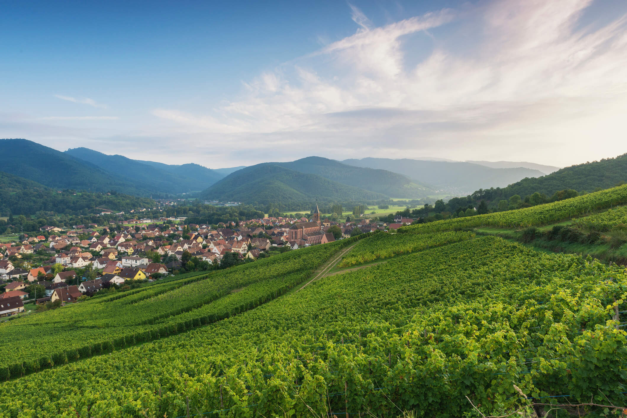 Vogesernas kulliga toppar och Alsaces vinodlingar